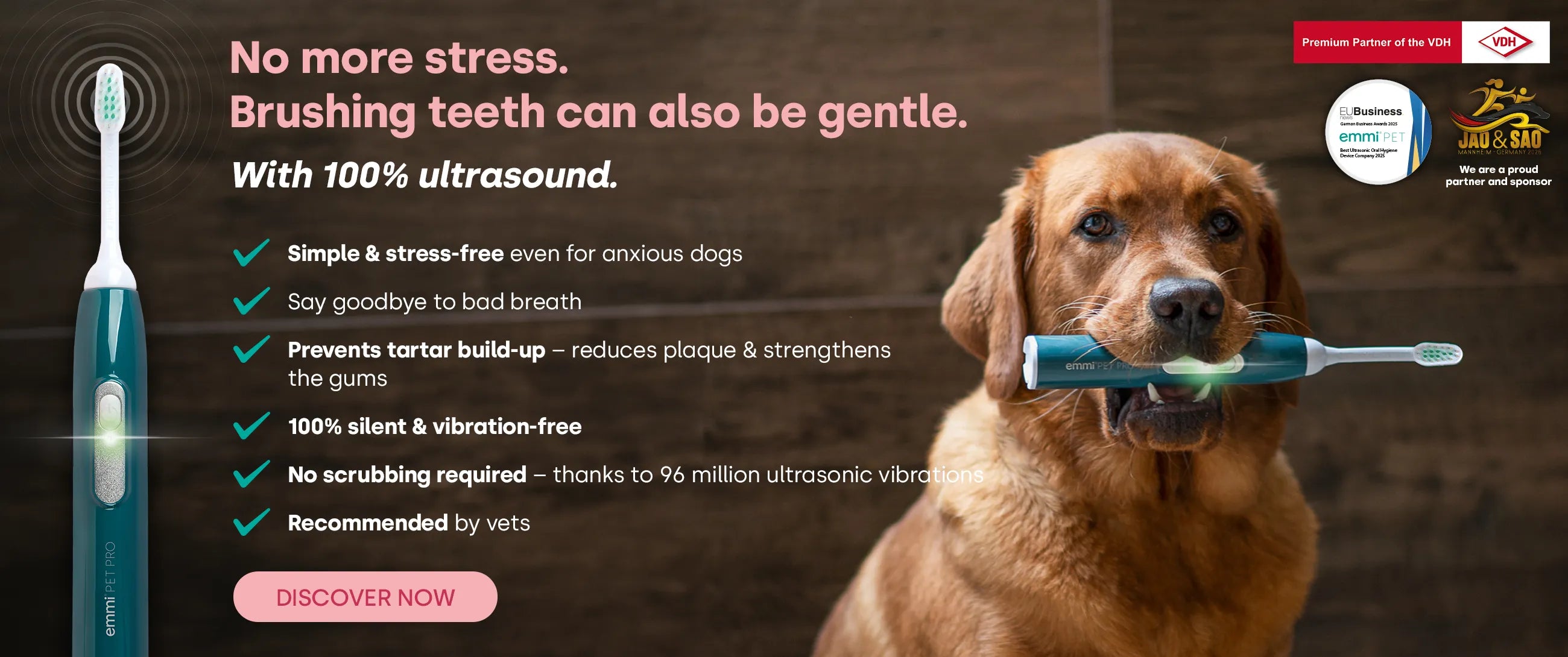 Recomendamos el cepillo de dientes de ultrasonido Emmi-Pet para la limpieza del diente durante elCambio de dientesusarlo incluso con animales muy jóvenes.Esto es particularmente útil para los perros jóvenes, ya que a menudo sufren dolor y las encías se encienden fácilmente cuando cambian.El cepillo de dientes de ultrasonido puede aliviar el dolor y, por lo tanto, facilitar el cambio de diente del animal.Además, el perro se puede usar para el cepillo Emmi-Pet a una edad temprana.La formación Tartar también se combina desde el principio.
