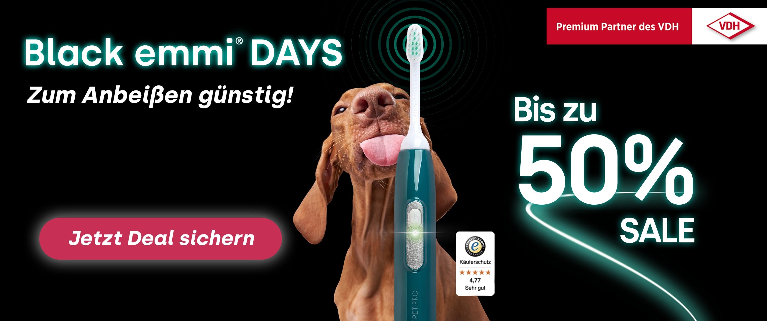 Allerdings ersetzt der Einsatz der Ultraschall-Zahnbürste nicht den Tierarztbesuch. Zahnerkrankungen sollten fachmännisch behandelt werden, damit Dein Hund schmerzfrei ist und der Zahnreinigung mit einer emmi-pet Hundezahnbürste nichts mehr im Weg steht. Wir empfehlen unsere emmi-pet für die Prophylaxe bzw. für die Prävention.