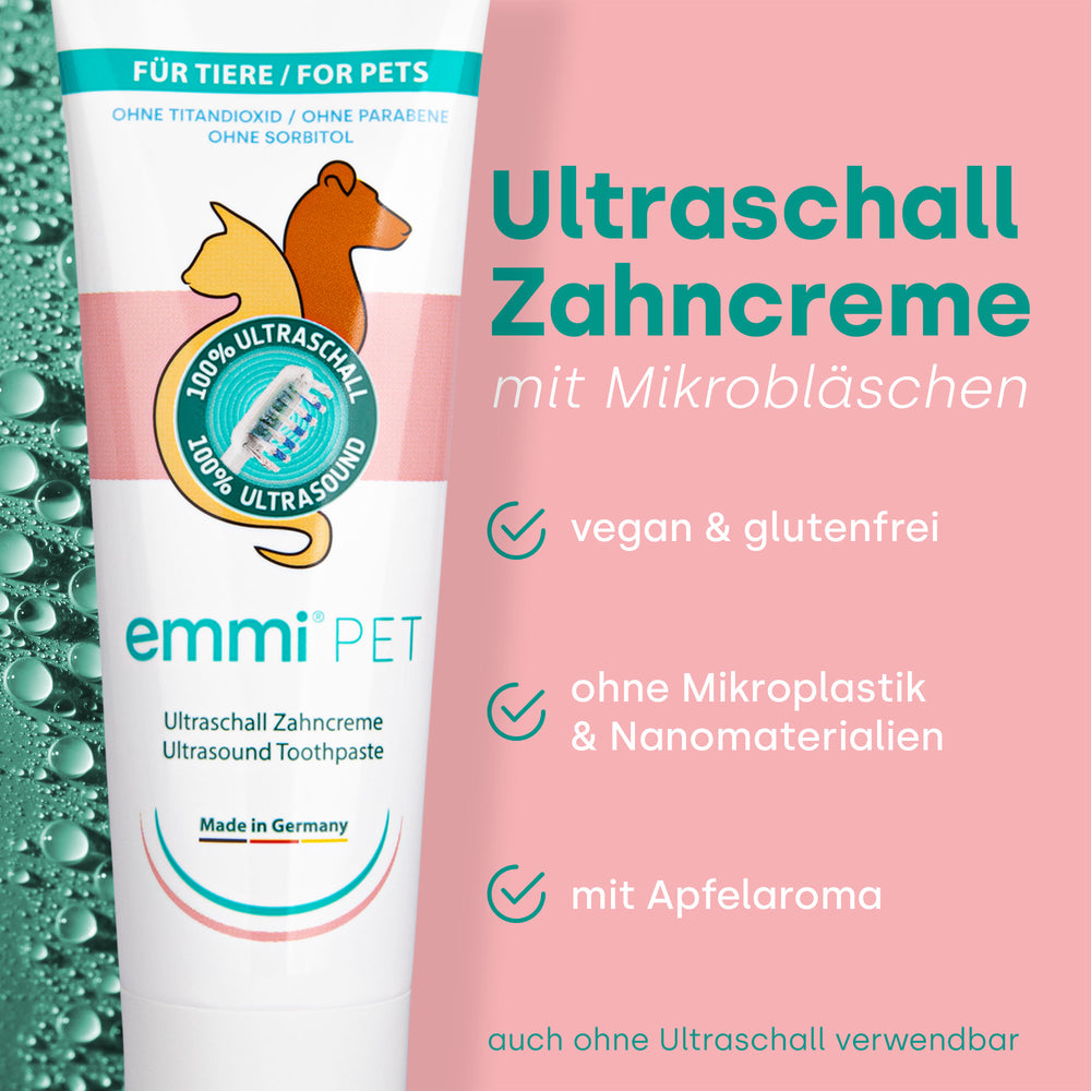 Die emmi-pet Ultraschallzahnbürste entfernt Zahnbelag sanft und effektiv, ohne mechanisches Schrubben. Ergänzt durch ein Dental Spray wird die Neubildung von Zahnstein verlangsamt. Eine regelmäßige Reinigung, zunächst zwei- bis dreimal wöchentlich, sorgt für gesunde Zähne und schützt das Zahnfleisch. Mit positiver Verstärkung wird die Zahnpflege schnell zur akzeptierten Routine.