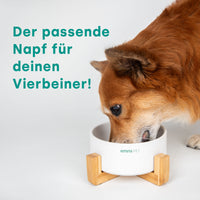 Mit dem minimalistischen Design des Keramiknapfs von emmi-pet bieten wir nicht nur eine stilvolle, sondern auch komfortable Fütterung für Haustier und Halter. Die angenehme Schwere des Napfes sowie das dazu passende Holzgestell bieten Stabilität und sichern den Genuss der täglichen Futterration. Die glatte Oberfläche des Hundenapfs macht eine tägliche Pflege und Hygiene einfach. Er kann mit der Hand gespült oder in der Spülmaschine gereinigt werden. Dank der rutschfesten Basis steht der Keramiknapf mit seinem Holzgestell stabil auf dem Boden und verhindert ein Umstoßen. Dadurch werden Verschüttungen minimiert und eine saubere Umgebung gewährleistet. Das Holzgestell ist mit einem Lack überzogen, um vor Wasser zu schützen. Der Fressnapf für kleine und große Hunde ist dank der modernen Optik ein Blickfang für jeden Tierbesitzer.