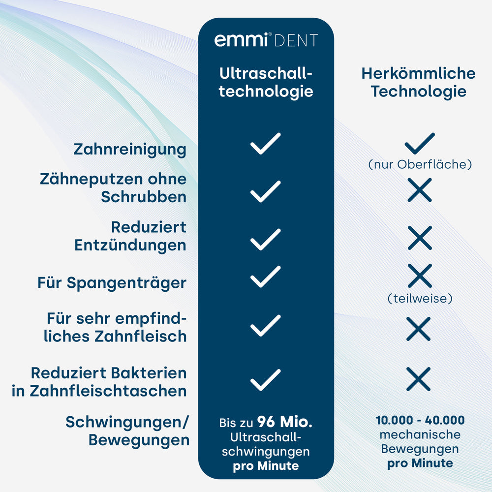 Die emmi-dent Slim setzt neue Maßstäbe in der Zahnpflege. Mit der fortschrittlichen Ultraschalltechnologie und ihrem schlanken Design sorgt sie für eine besonders gründliche und sanfte Reinigung von Zähnen und Zahnfleisch – ganz ohne mechanische Bewegungen.