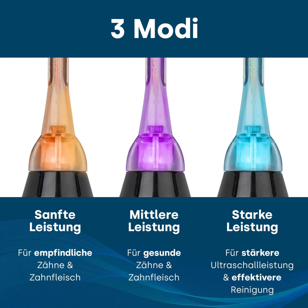 3 Reinigungsmodi: Wählen Sie zwischen sanfter, mittlerer und starker Leistung – individuell abgestimmt auf Ihre Zahngesundheit.