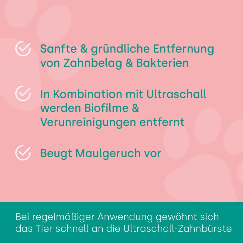 Die emmi-pet Ultraschall Zahnpasta für Tiere bietet zahlreiche Vorteile, die sie zu einer hervorragenden Wahl für die Zahnpflege deines Haustiers machen: Sanfte Reinigung ohne Abrasion: Dank des Ultraschalls entfällt das abrasive Bürsten der Zähne. Der RDA-Wert (Relative Dentin Abrasion) beträgt 0, was bedeutet, dass die Zahnpasta besonders sanft zum Zahnschmelz und Zahnfleisch deines Tieres ist. Effektive Entfernung von Biofilmen und Bakterien: Die Mikrobläschen-Technologie sorgt dafür, dass selbst hartnäckige Beläge und Bakterien entfernt werden, ohne die Zähne mechanisch zu belasten. Vorbeugung von Zahn- und Zahnfleischerkrankungen: Durch die schonende, aber gründliche Reinigung bleiben die natürlichen Schutzfunktionen der Zähne erhalten, wodurch das Risiko für Zahn- und Zahnfleischerkrankungen deutlich verringert wird. Bekämpfung von Mundgeruch: Die regelmäßige Anwendung der emmi-pet Zahnpasta hilft, schlechten Maulgeruch zu verhindern, indem sie die Anzahl der geruchsverursachenden Bakterien reduziert.