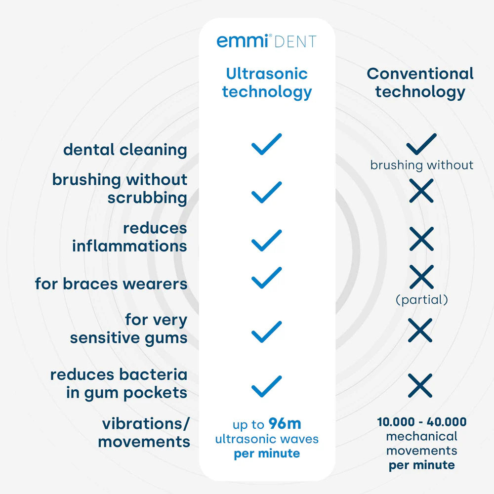 The emmi-dent Platinum is an electric toothbrush based on ultrasonic technology and designed for particularly thorough cleaning of teeth and gums. Compared to conventional toothbrushes, the emmi-dent Platinum operates at a frequency of up to 96 million multi-frequency vibrations per minute (without mechanical movement) to target plaque and bacteria.