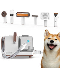 Our device has three different suction levels, namely 3 KPA, 7 KPA and 10 KPA. The lowest suction level is suitable for sensitive pets and reduces the startle response during use. You can choose the different suction levels according to the pet's fur to ensure more efficient cleaning of all types of hair. Apart from the clipper, our device is equipped with 5 different types of professional brushes, including 1x trimmer, 1x grooming comb, 1x slicker comb, 1x 2-in-1 flat brush, 1x brush with pet hair roller and 1x massage brush. They are suitable for different coat types and lengths in dogs and cats.