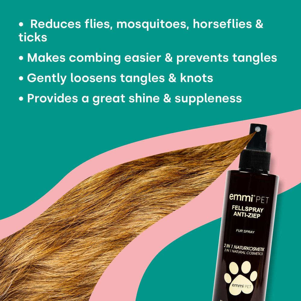 With the Anti-Tangle Natural Coat Spray, pulling brushing is a thing of the past. The 100% natural formula makes combing easier, moisturizes, strengthens the hair structure and protects against external influences – for a silky soft, supple coat.