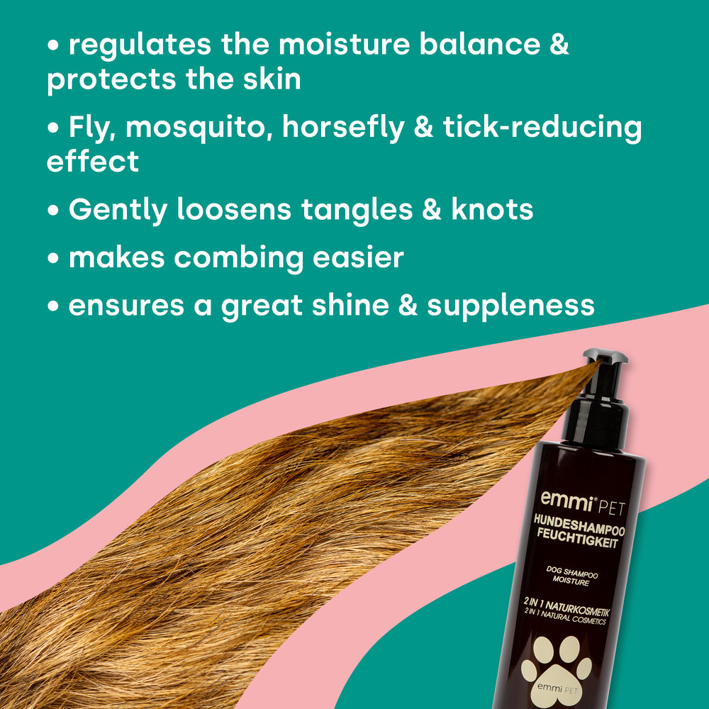 emmi-PET Moisture Natural Dog Shampoo thoroughly cleanses skin and coat without drying them out. The plant-based formula with moisturizing extracts of aloe vera, herbs, sea buckthorn oil, and lemon eucalyptus supports the skin's natural protective barrier, provides a healthy shine, and makes the coat easier to comb – ideal for sensitive dogs and puppies from 10 weeks of age.