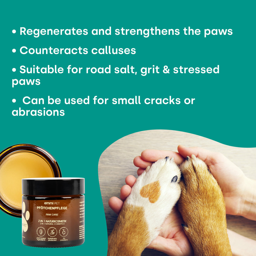 The 2-in-1 Natural Paw Care protects stressed paw pads and supports regeneration in rough, dry areas or small cracks. Valuable active ingredients such as shea butter, coconut oil, arnica, and calendula have anti-inflammatory and nourishing properties – ideal for use in changing temperatures and on varying surfaces.