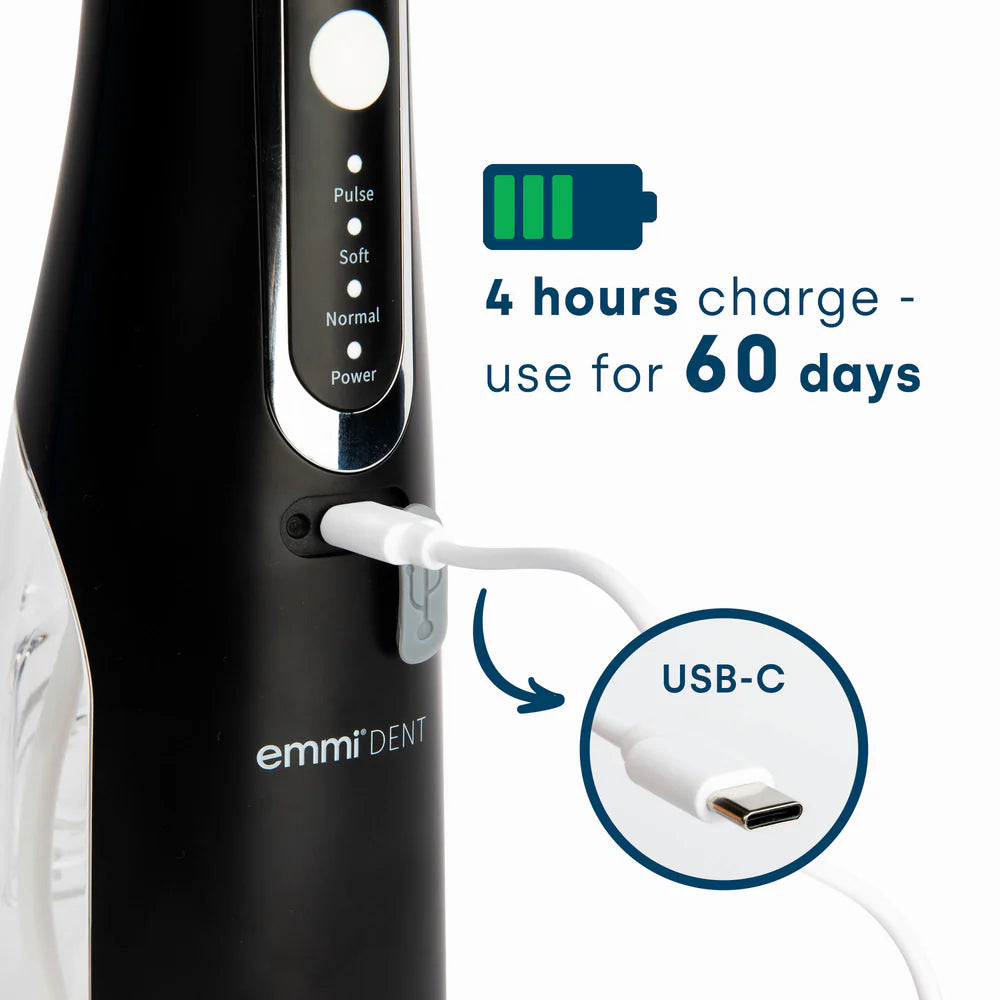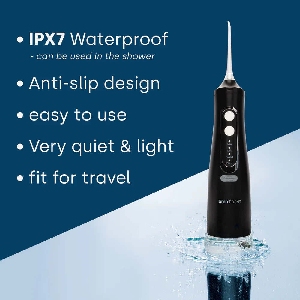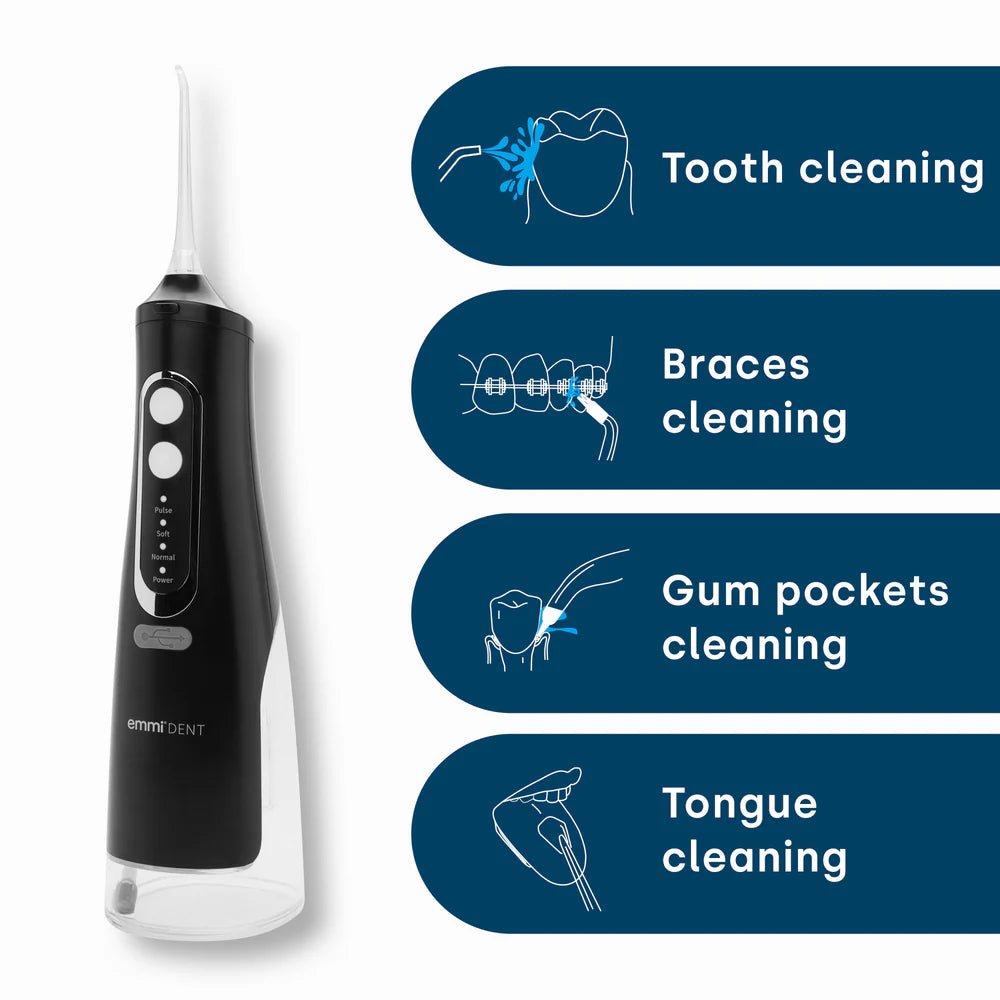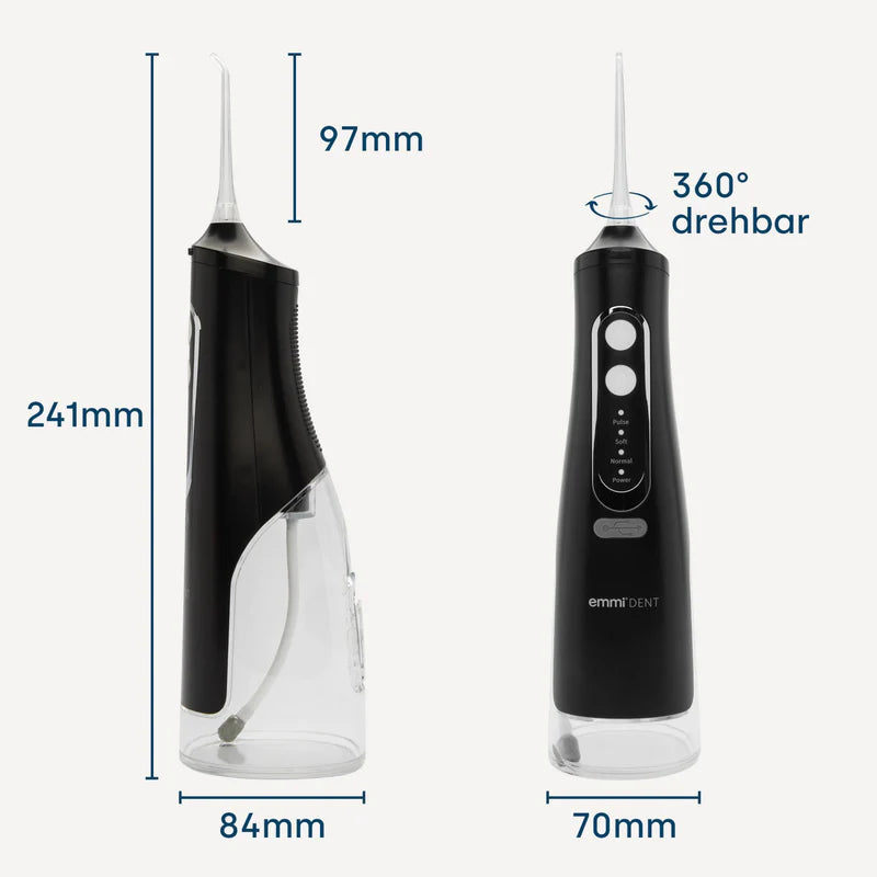 In order to clean the spaces between your teeth thoroughly and effectively, brushing your teeth alone is often not enough. The emmi-dent Oral irrigator developed to protect against gum problems - where conventional toothbrushes cannot reach. Compared to dental floss, the emmi-dent Oral irrigator for perfect cleaning even with closely spaced teeth or hard-to-reach interdental spaces. The device has four modes: pulse, gentle, normal and strong. With the four nozzle attachments included, you have the right nozzle to hand for every cleaning. We recommend replacing the nozzles every 3 months.