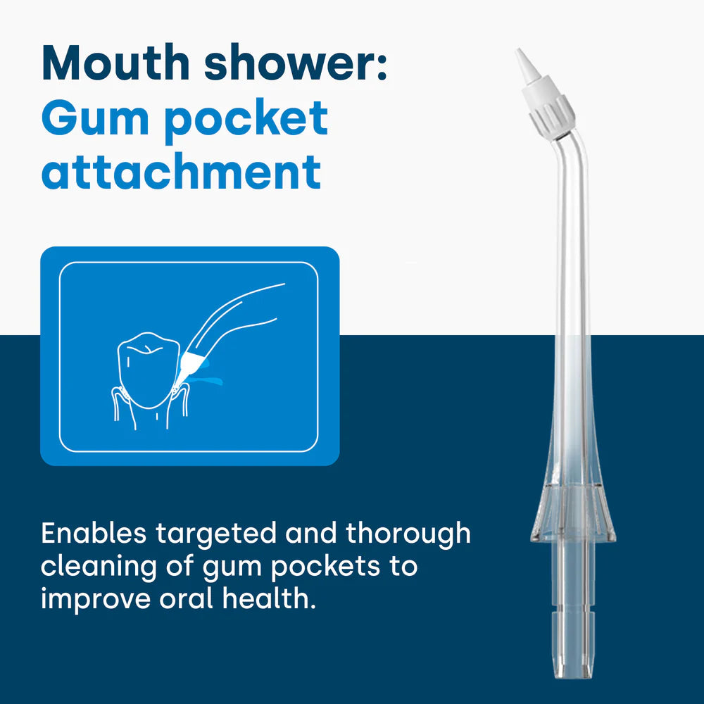 The special nozzle attachments of the oral irrigator can be used to clean periodontal pockets. They help to remove bacteria from deeper areas of the gums.