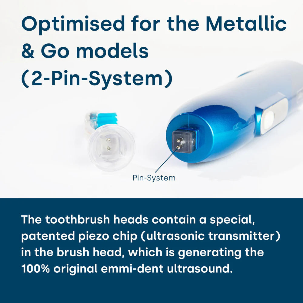 The ultrasonic brush head of the emmi-dent Ultrasonic toothbrushes contain a special, patented piezo chip (ultrasonic generator) in the brush head to generate the 100% original emmi-dent Ultrasound. In the sockets of the emmi-dent Metallic and Go Ultrasonic brush head have 2 hardened contact pins for connection to the emmi-dent Metallic and Go handpiece integrated. This innovation prevents jamming when plugging in and the ultrasonic brush head can be easily plugged in and removed.