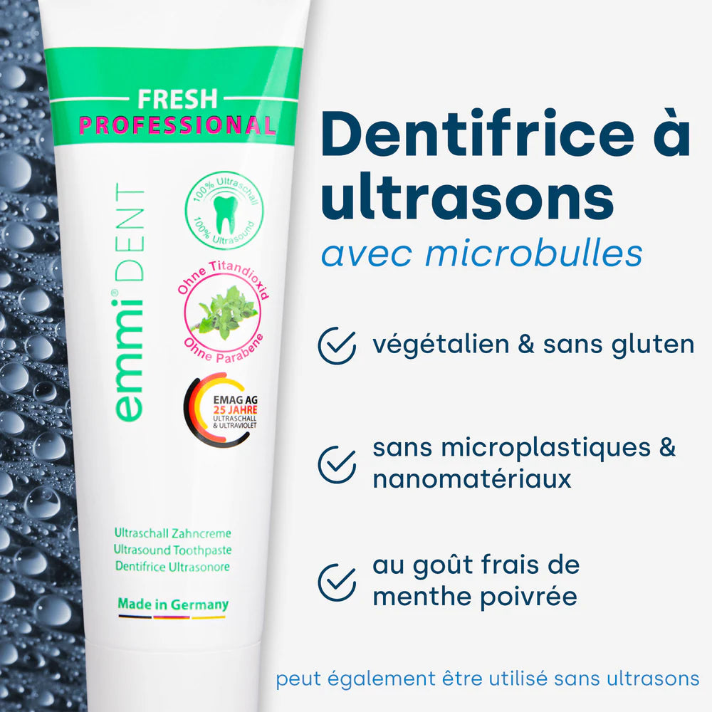 Les ondes ultrasonores pénètrent profondément dans les espaces entre les dents et la gencive. Ils y dissolvent les bactéries et la plaque dentaire, ce qui prévient efficacement la carie dentaire, la gingivite et d'autres maladies dentaires. Pour des résultats particulièrement approfondis, le dentifrice à ultrasons emmi-dent spécialement développé est utilisé. Les microbulles incluses renforcent considérablement l'effet des ultrasons.