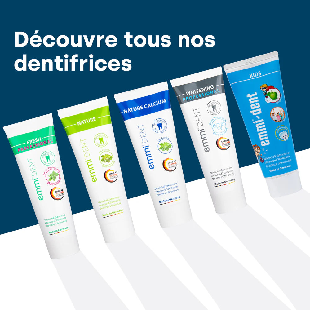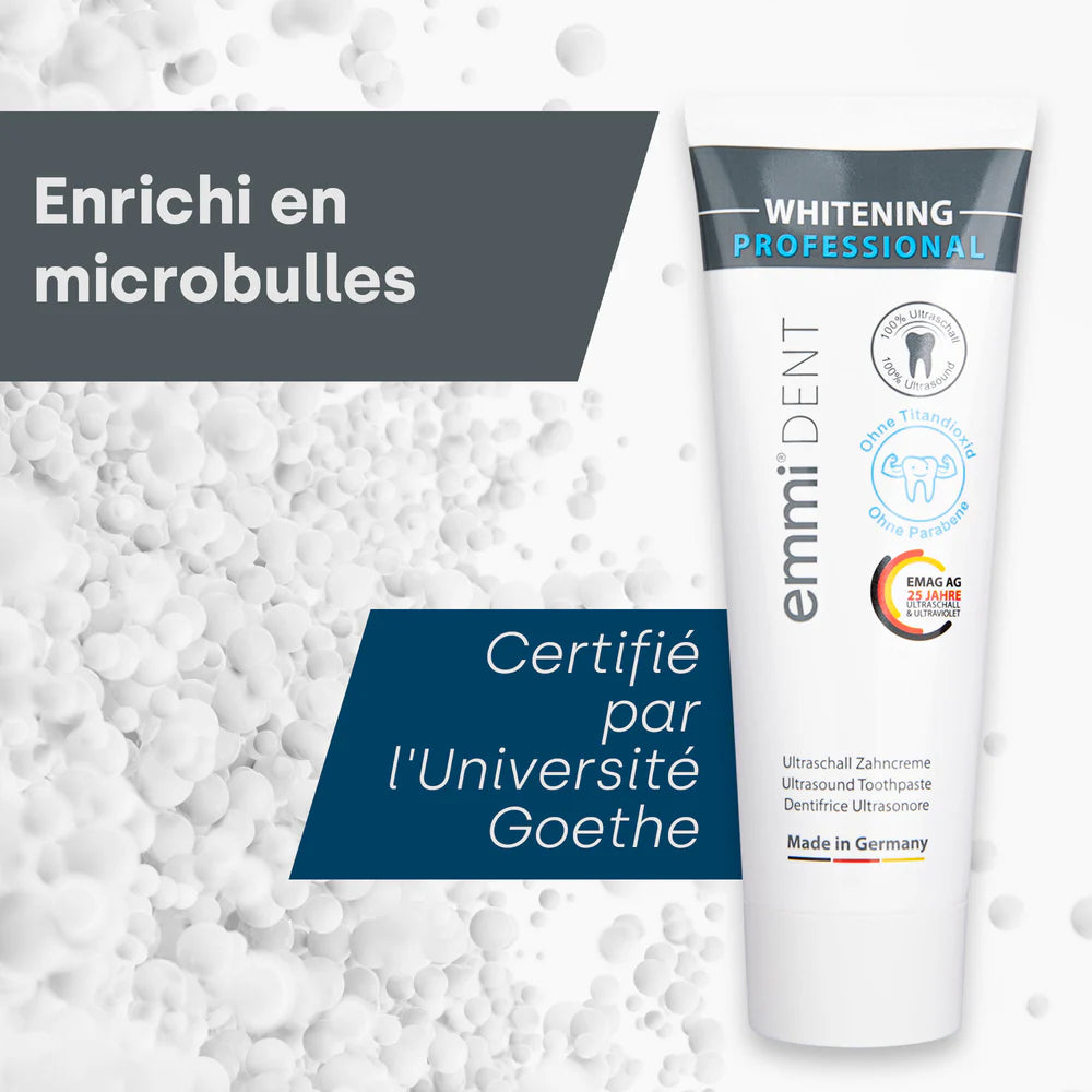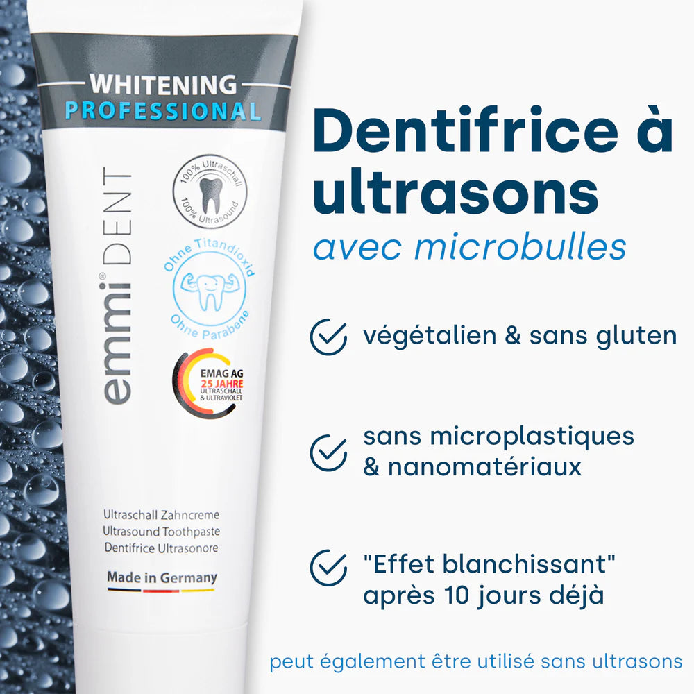 Donnez à vos dents la sensation d'un blanc éclatant avec le révolutionnaire emmi-dent Dentifrice blanchissant à ultrasons. Plongez dans le monde des fonctionnalités et des avantages uniques de emmi-dent Dentifrice blanchissant à ultrasons :