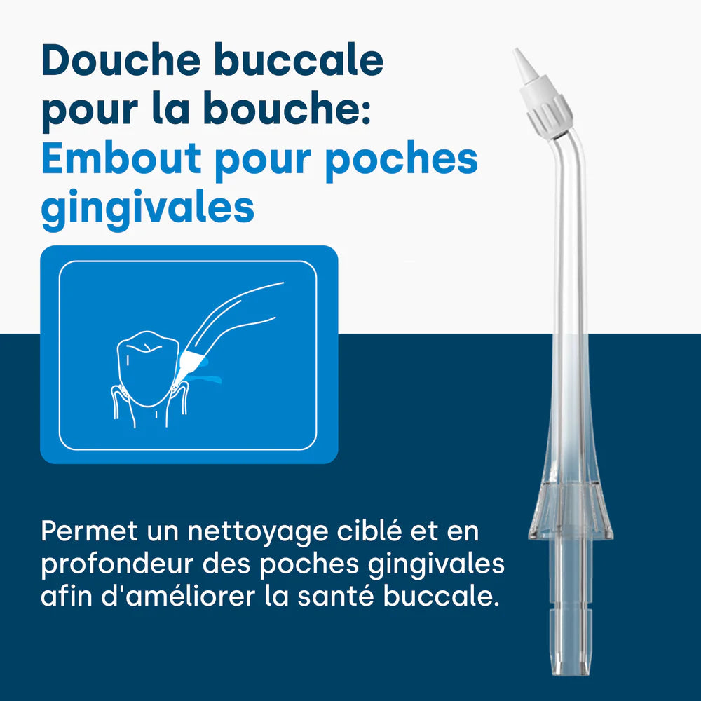 Les embouts spéciaux de l'irrigateur buccal peuvent être utilisés pour nettoyer les poches parodontales. Ils aident à éliminer les bactéries des zones plus profondes des gencives.