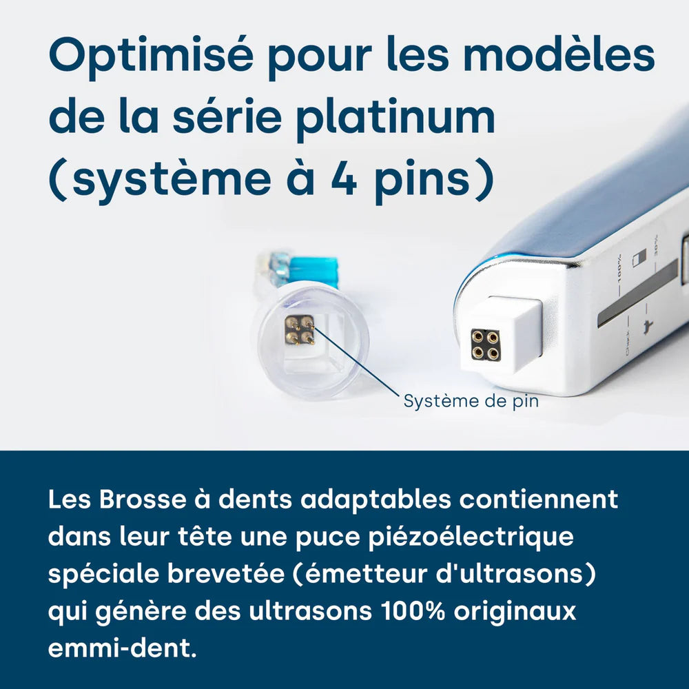 L'échographie têtes de brosse le emmi-dent Les brosses à dents à ultrasons contiennent une puce piézo spéciale brevetée (générateur d'ultrasons) dans la tête de brosse pour générer l'original à 100 % emmi-dent ultrason. Dans les bases de la emmi-dent Ultrason Platine têtes de brosse 4 broches de contact ont été utilisées pour se connecter au emmi-dent Combiné Platinum intégré. Cette innovation évite le blocage lors du branchement et de l'échographie têtes de brosse peut être facilement attaché et retiré. De plus, grâce au timing ultrasonique optimisé, ils sont jusqu'à 4 fois plus efficaces que les têtes de brosse le emmi-dent Métallique.