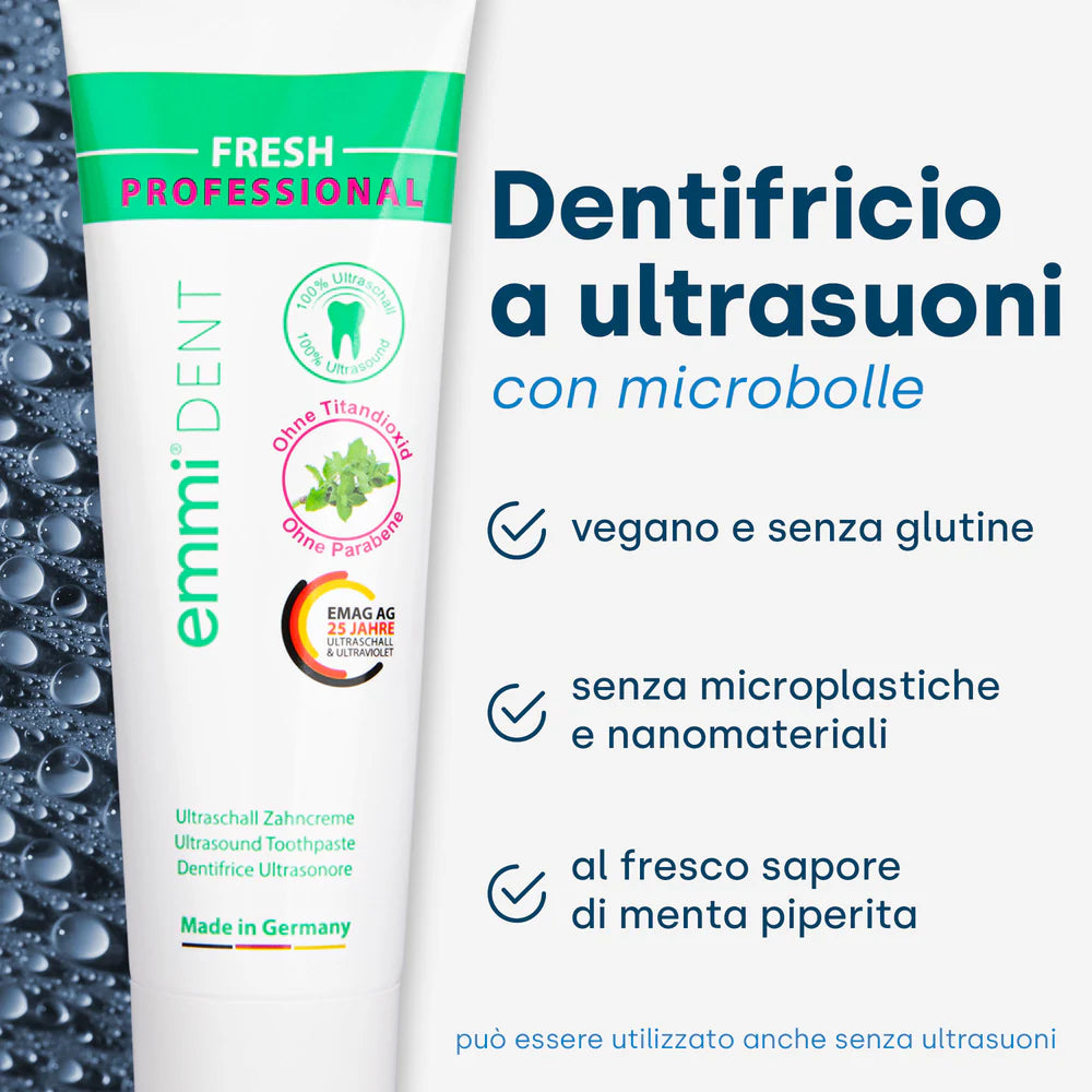 Il disco piezoelettrico brevettato a livello mondiale (generatore di ultrasuoni) nella testina dello spazzolino genera gli ultrasuoni e li dirige con fino a 96 milioni di vibrazioni dell'aria al minuto direttamente nello spazzolino arricchito di microbolle. emmi-dent dentifrici ad ultrasuoni. Le onde ultrasoniche distruggono la struttura delle microbolle, creando un effetto di aspirazione che rimuove il biofilm e i depositi. In questo modo potrai pulire a fondo i denti e proteggere le gengive senza dover spazzolare. Il risultato sono denti visibilmente lisci. I batteri vengono ridotti e la cavità orale rimane fresca più a lungo dopo la pulizia.