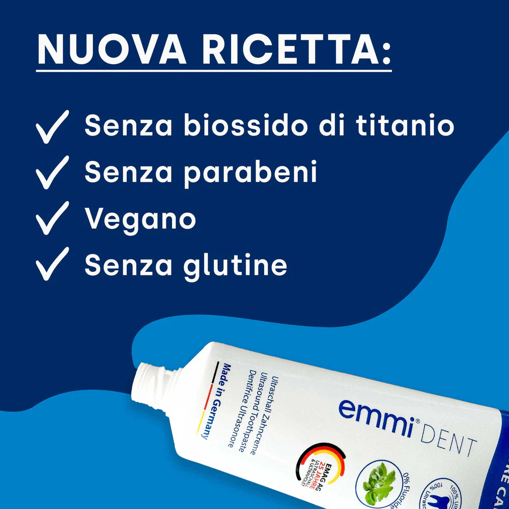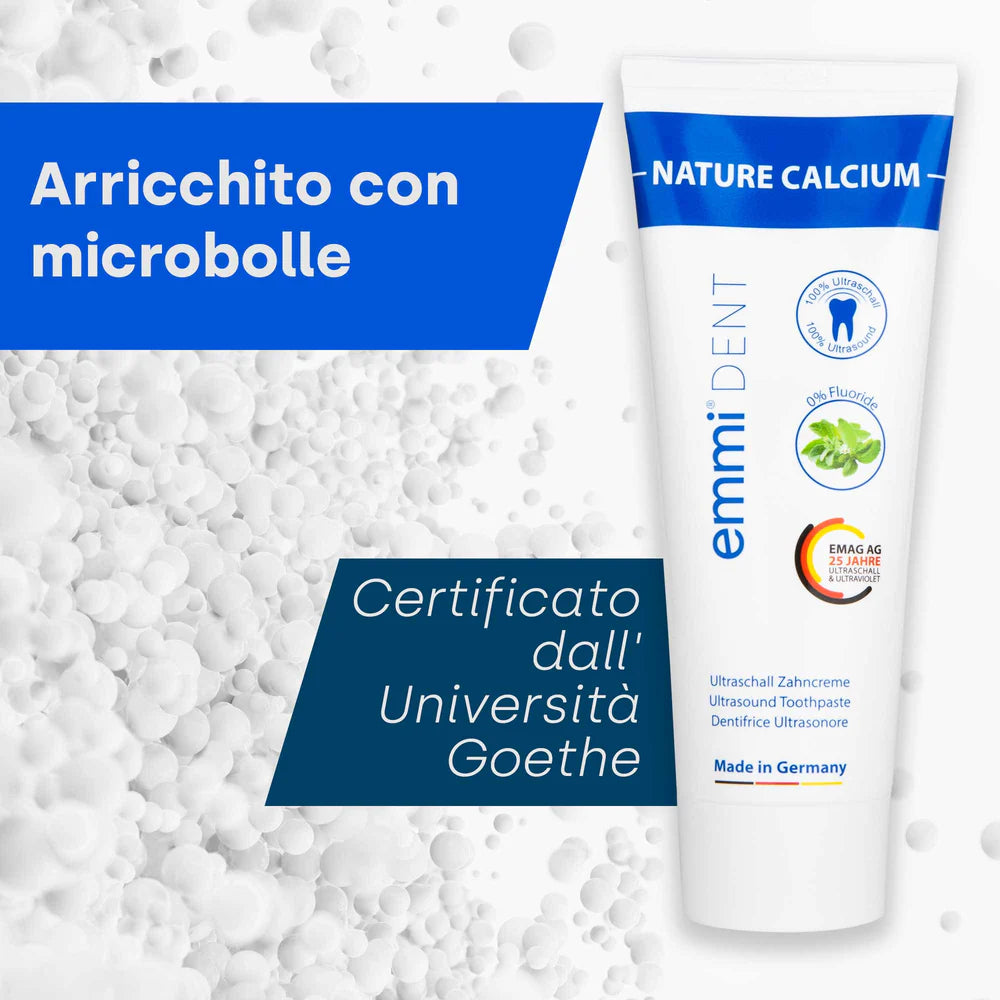 Non perdere l'occasione emmi-dent Prova il dentifricio Nature Calcium Ultrasonic e rinforza i tuoi denti in modo naturale. Ordina oggi e goditi i vantaggi di cure odontoiatriche di alta qualità, senza fluoro, ma con il potere del calcio.