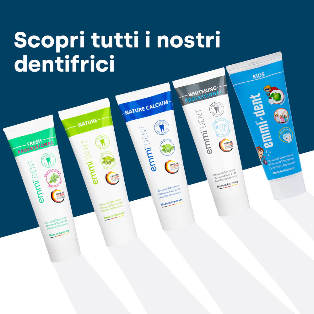 Grazie all'avanzata tecnologia a ultrasuoni del dentifricio emmi-dent Nature, la placca viene rimossa delicatamente e a fondo. Anche i depositi più ostinati vengono rimossi in modo efficace, lasciando la bocca pulita e sana. La combinazione di gel di silice e onde ultrasoniche del nostro spazzolino elettrico a ultrasuoni garantisce una pulizia profonda, mentre il sorbitolo è delicato su denti e gengive. Il nostro dentifricio lascia i tuoi denti pulitissimi e il tuo sorriso splendente.