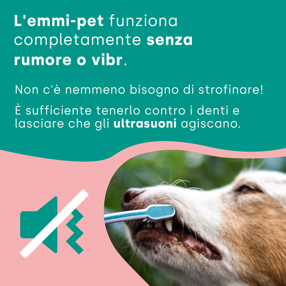 Lo spazzolino ultrasonico emmi-pet è un'opzione delicata e silenziosa per la cura dentale del tuo cane. Grazie alla tecnologia a ultrasuoni, che genera ben 96 milioni di vibrazioni al minuto, è possibile lavarsi i denti senza dover strofinare.