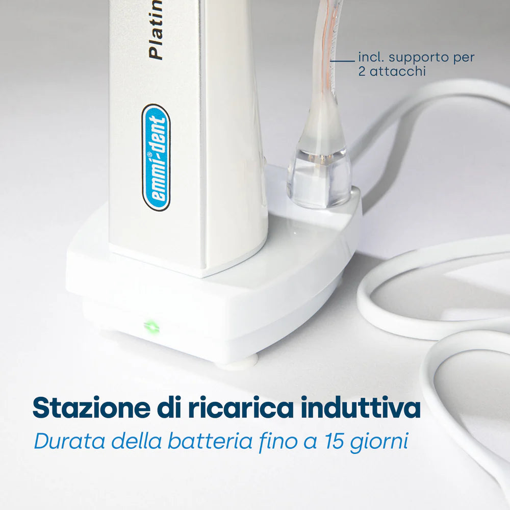 Grazie alla tecnologia a ultrasuoni senza abrasione, emmi-dent PlatinumCAM è particolarmente indicata per persone con gengive sensibili, impianti, apparecchi ortodontici o malattie dentali come la parodontite. Le delicate vibrazioni puliscono delicatamente senza irritare denti o gengive. In questo modo i tuoi denti resteranno sani senza danneggiarne lo smalto.