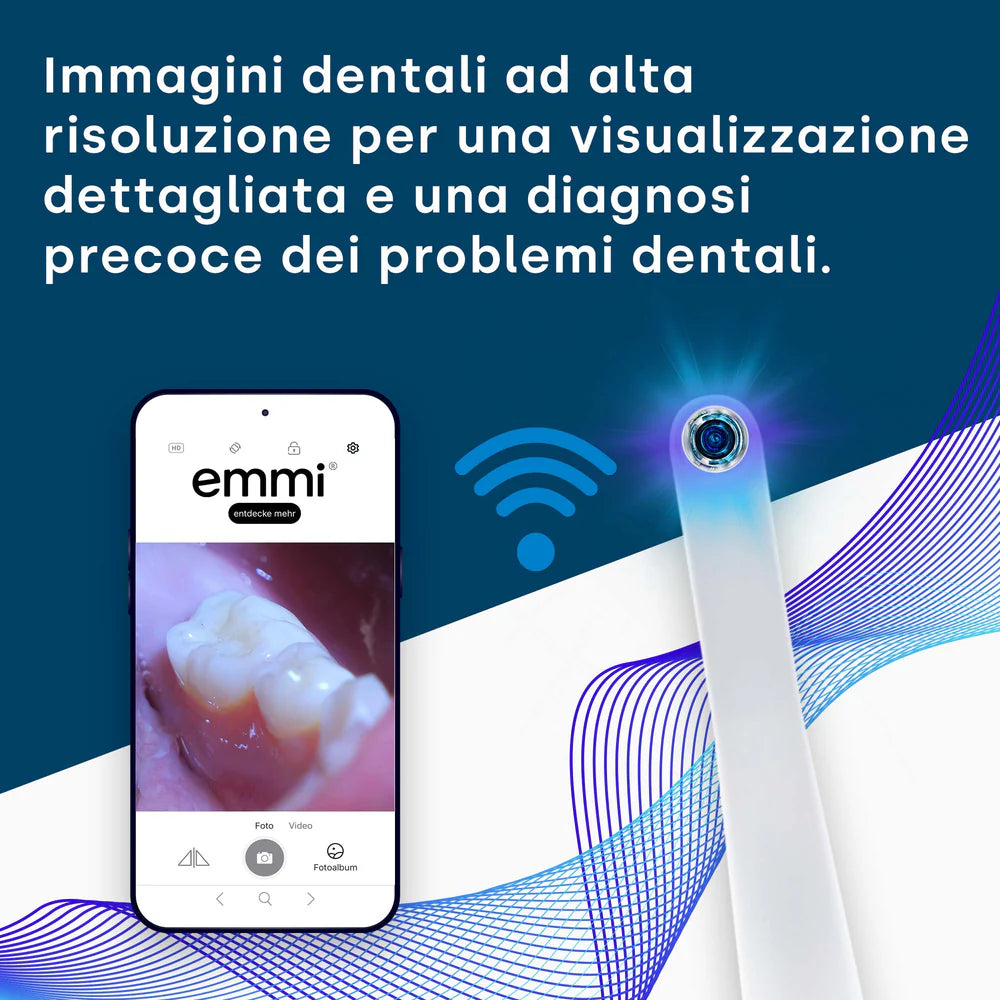 La PlatinumCAM di emmi-dent rappresenta un'innovazione rivoluzionaria nell'assistenza odontoiatrica grazie alla sua telecamera dentale integrata. Questa telecamera consente di ispezionare la cavità orale in tempo reale. Collegandoti all'app emmi sul tuo smartphone o tablet, puoi rendere visibili anche le zone difficili da raggiungere e assicurarti che la tua bocca sia pulita fino all'ultimo angolo.