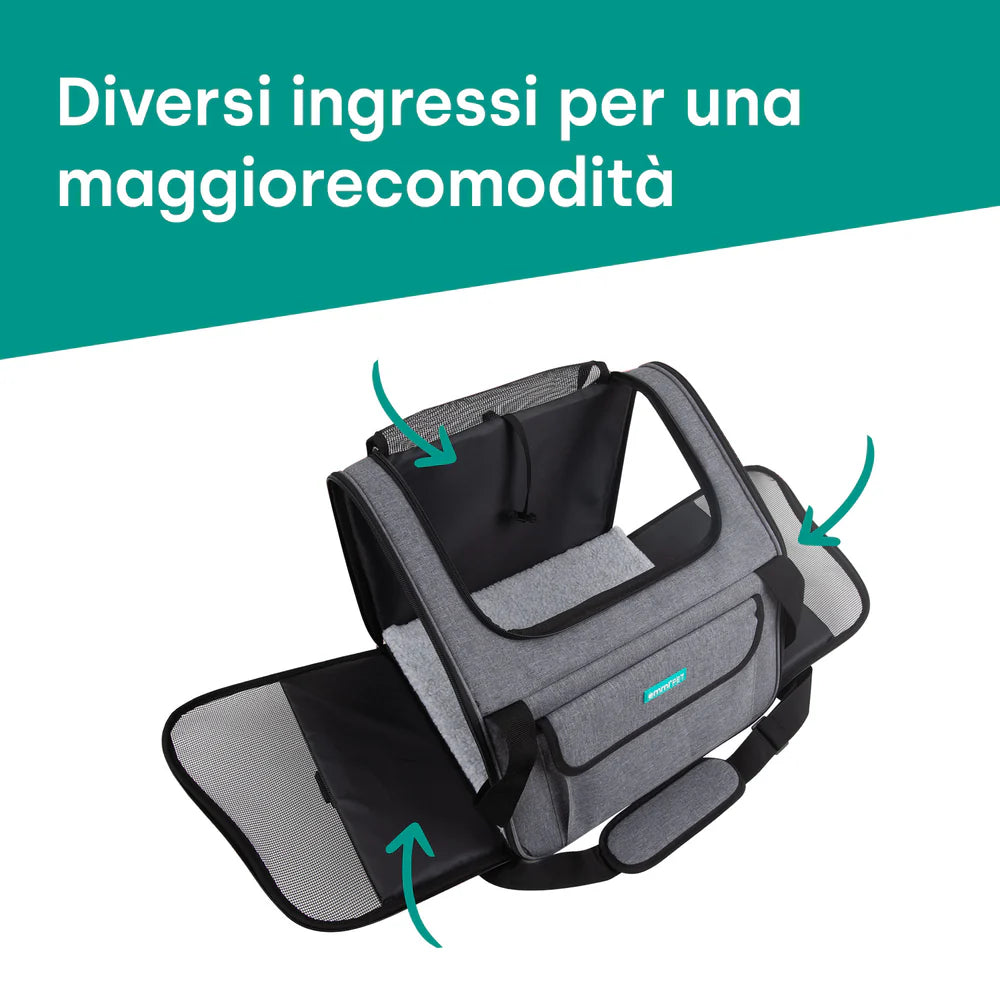 Non importa se viaggi con il tuo amico a quattro zampe in auto, in aereo o se stai per partire per un viaggio: il emmi-animale domestico Travel Bag Large ti offre una soluzione sicura e comoda per avere sempre con te il tuo compagno a quattro zampe. Investi nella sicurezza e nel benessere del tuo animale domestico con questo trasportino da viaggio di alta qualità.