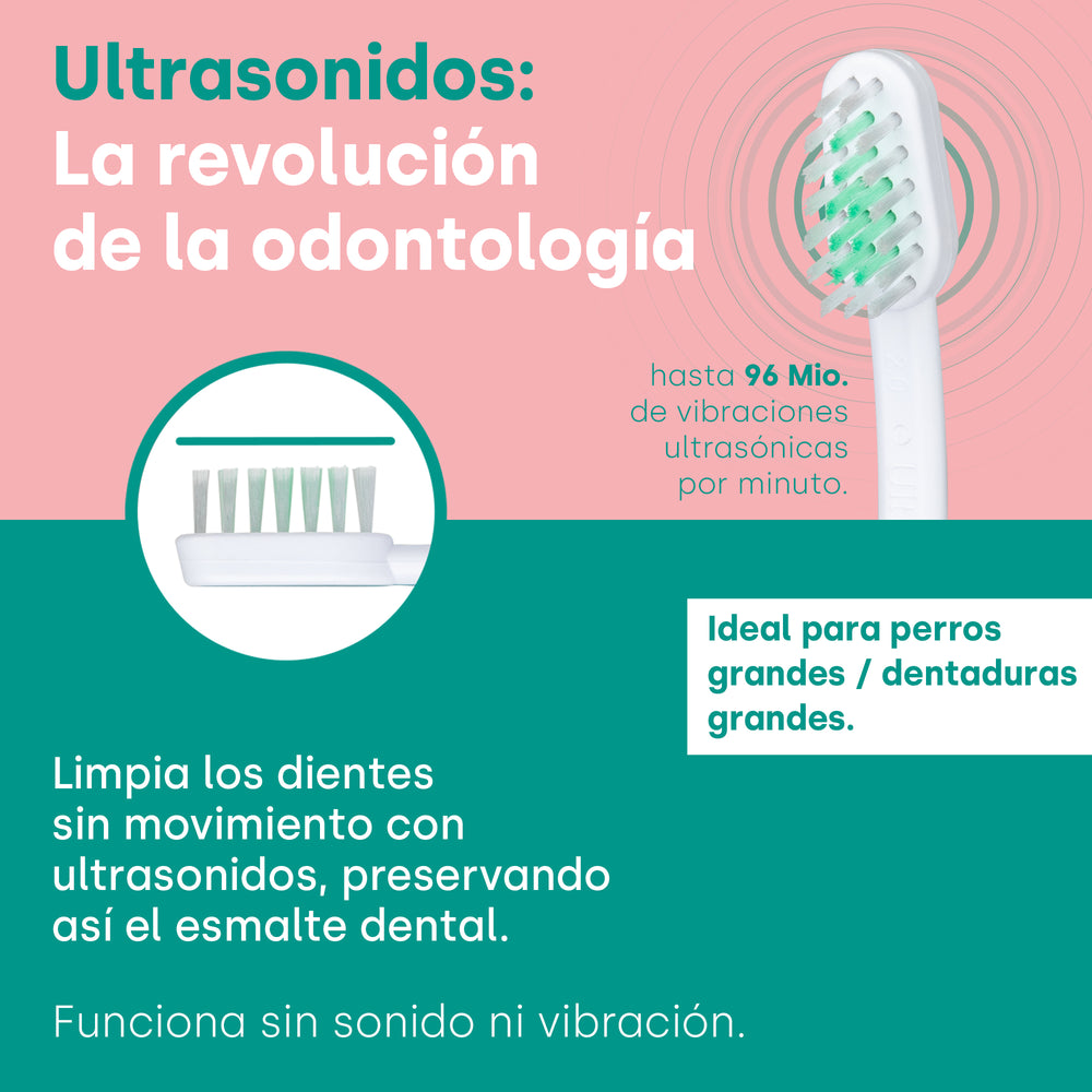 El emmi-mascota El cabezal del cepillo ultrasónico aprovecha la tecnología ultrasónica patentada para llegar incluso a las áreas difíciles de alcanzar que las cerdas convencionales tienen dificultad para limpiar. Gracias a esta revolucionaria tecnología, la placa y las impurezas se eliminan de forma suave y eficaz para favorecer la salud dental de tu mascota y prevenir posibles enfermedades.