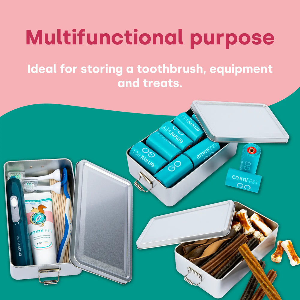 Made of sturdy tinplate, it reliably protects the emmi-PET Dental Sticks from moisture.