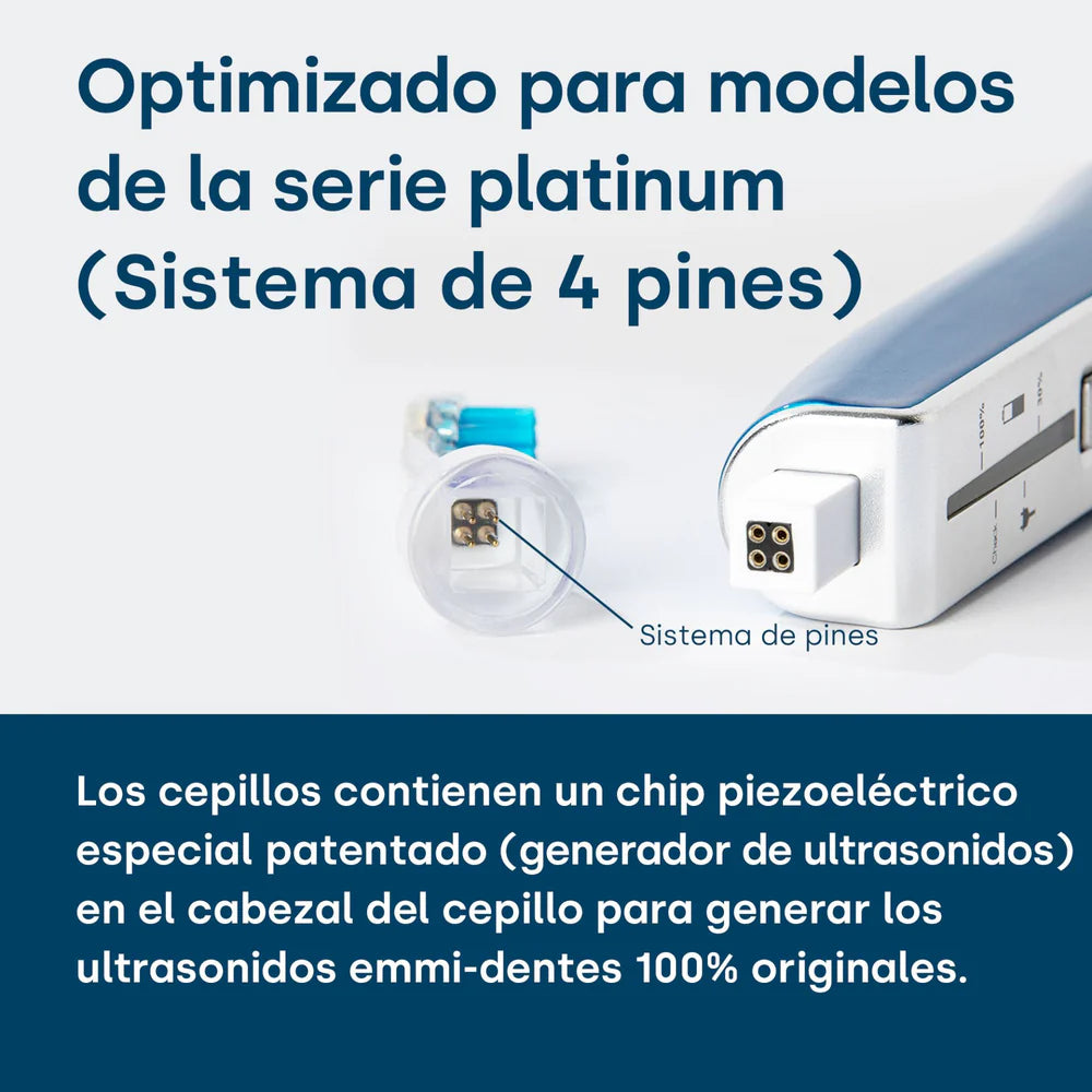 La ecografia cabezales de cepillo el emmi-dent Los cepillos de dientes ultrasónicos contienen un chip piezoeléctrico especial patentado (generador ultrasónico) en el cabezal del cepillo para generar el 100% original. emmi-dent ultrasonido. En las bases de la emmi-dent Ultrasonido de platino cabezales de cepillo Se utilizaron 4 pines de contacto para conectar a la emmi-dent Auricular platino integrado. Esta innovación evita atascos al enchufar y el ultrasonido cabezales de cepillo Se puede colocar y quitar fácilmente. Además, gracias a la sincronización ultrasónica optimizada, son hasta 4 veces más efectivos que los cabezales de cepillo el emmi-dent Metálico.