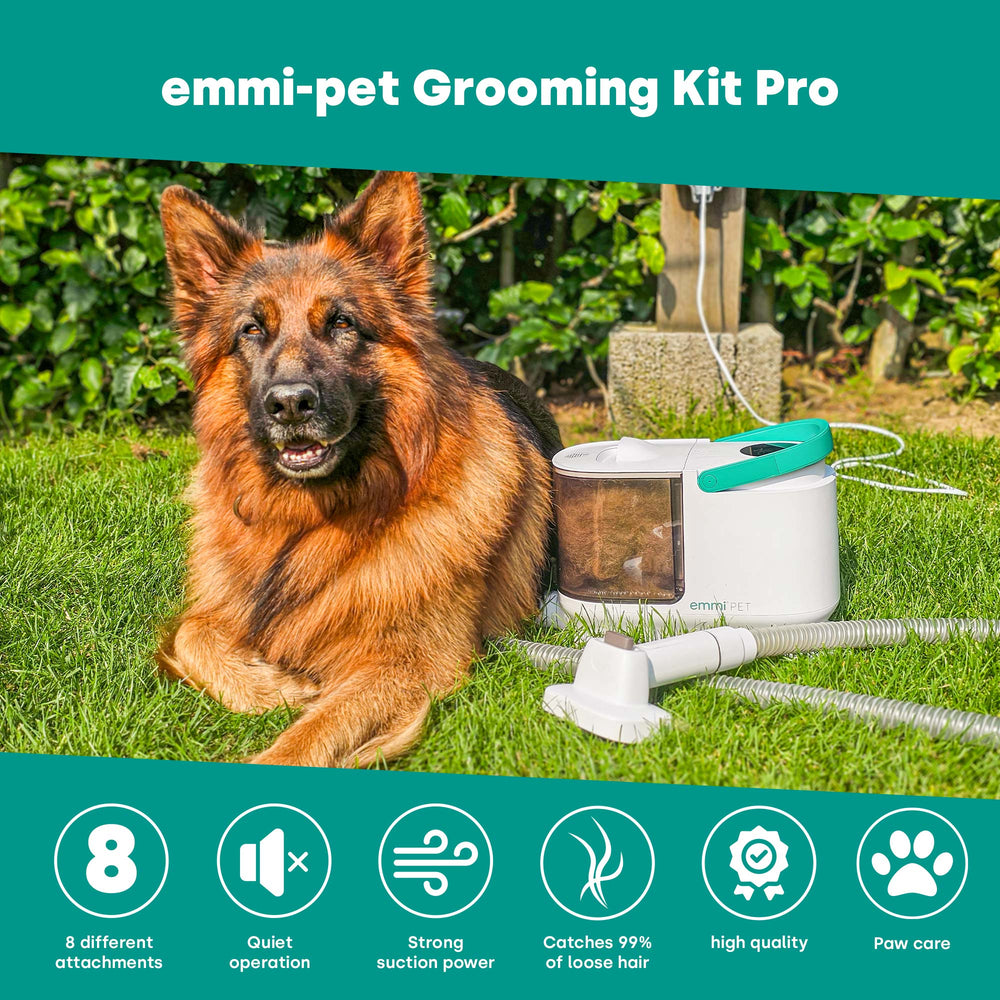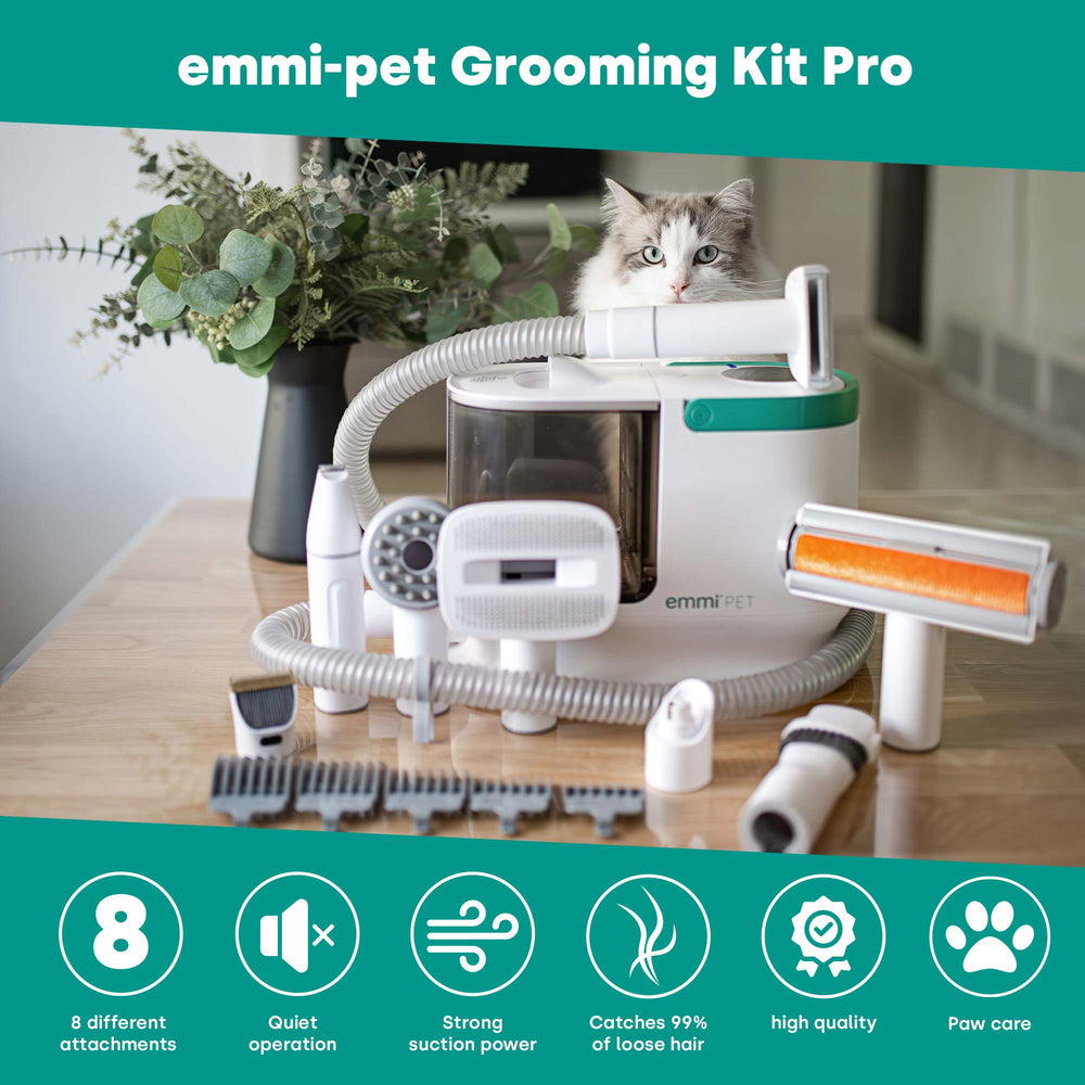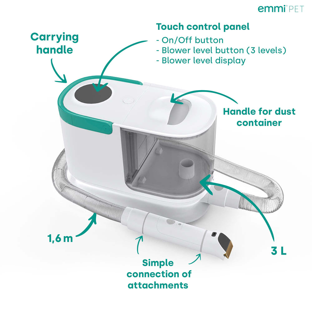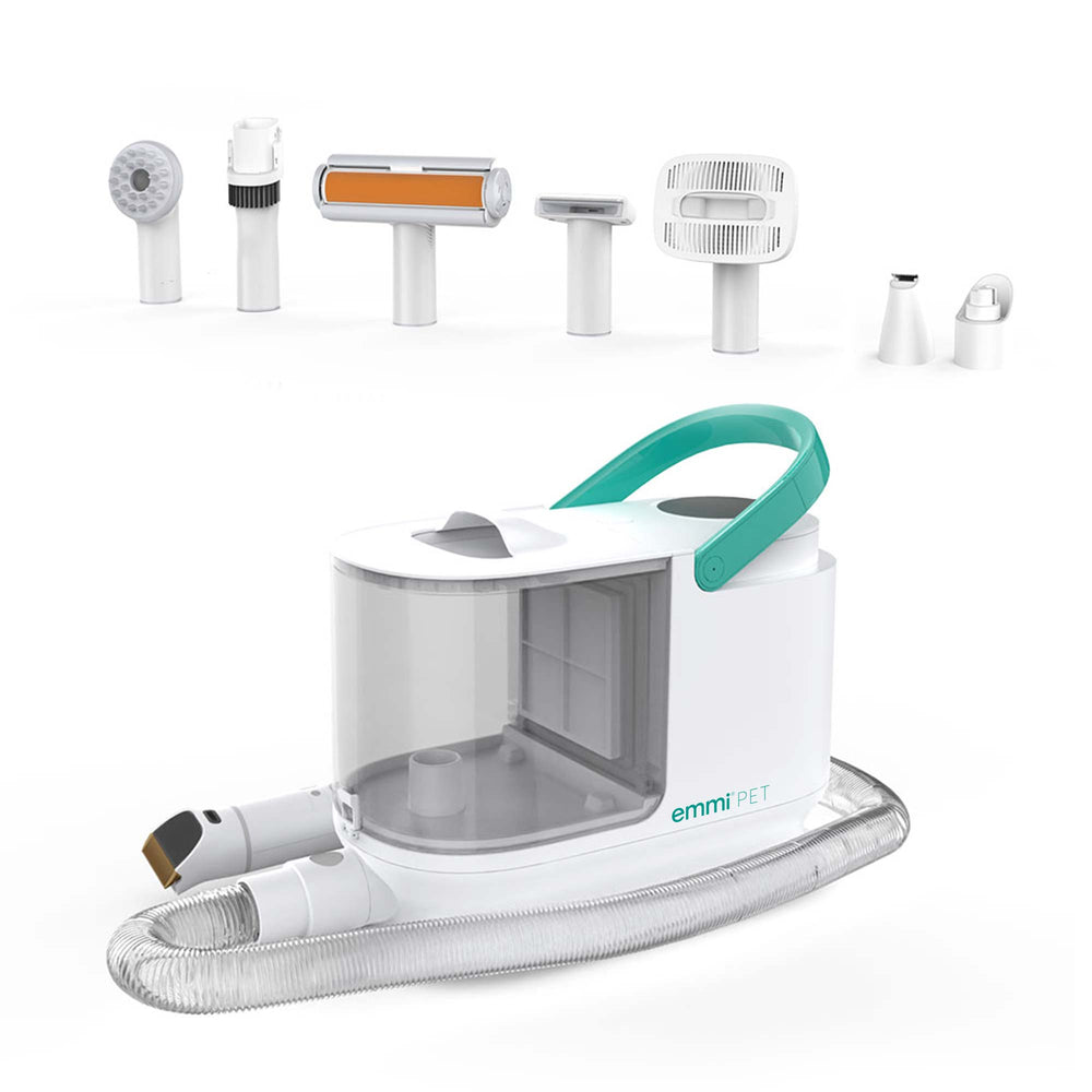 Mantener una casa limpia puede ser un desafío para los dueños de mascotas. El pelo de animales en alfombras, muebles y pisos duros es omnipresente. ¿La solución? El kit de aseo emmi-pet combina una cortadora, un peine y una aspiradora de pelo de mascotas en un solo dispositivo: una aspiradora sin bolsa con cortadora que ha sido especialmente desarrollada para las necesidades de perros y gatos para eliminar y cortar eficazmente el pelo de las mascotas y minimizar los olores.