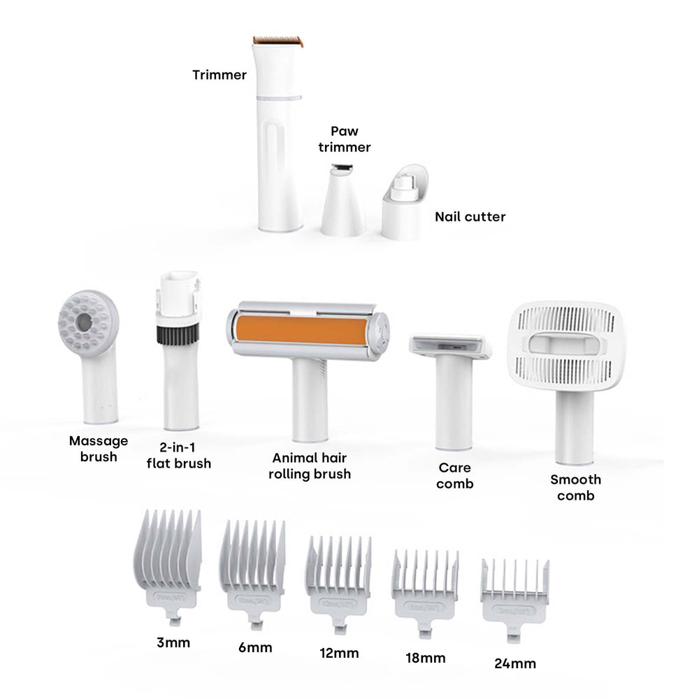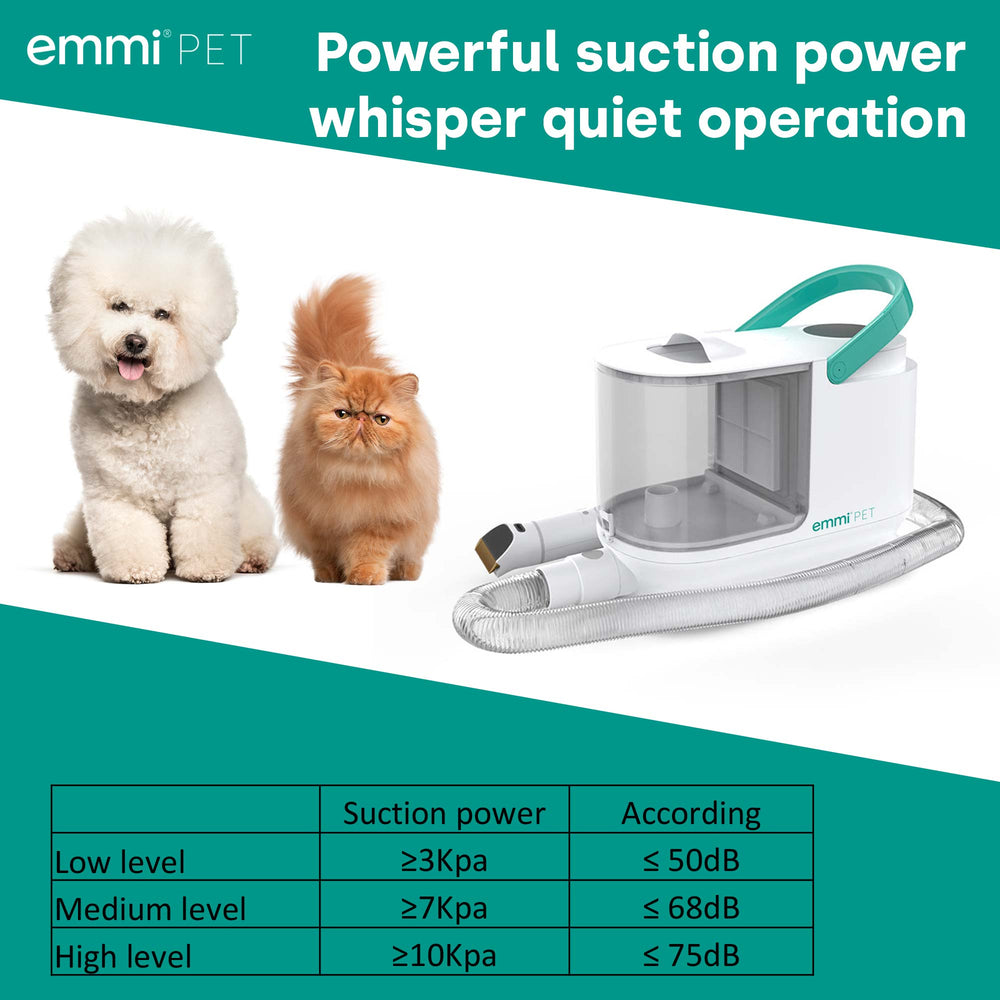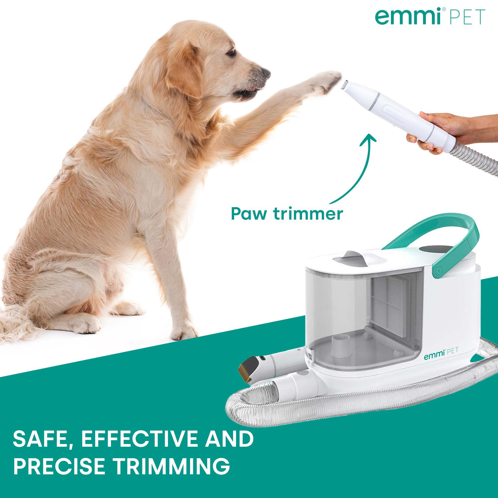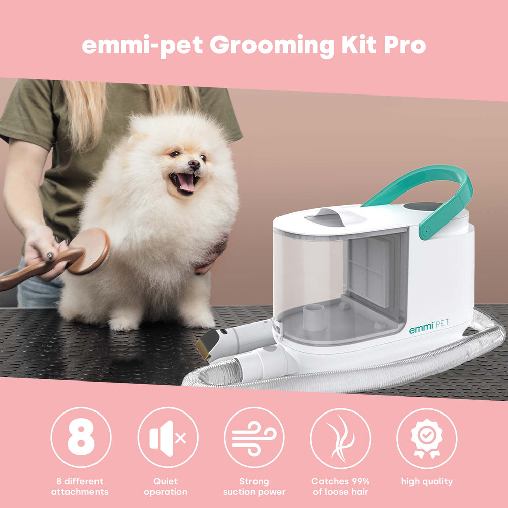 El kit de aseo incluye no solo una aspiradora, sino también una cortadora para acicalar eficazmente a su perro o gato en casa. Esto hace que el kit de aseo emmi-pet sea el mejor aspirador de pelo de mascotas con cortadora en comparación con otros modelos. Para aquellos que necesitan un cuidado aún más completo, la versión Pro también ofrece un cortaúñas y cortapatas especial, ideal para un cuidado preciso de patas y uñas.