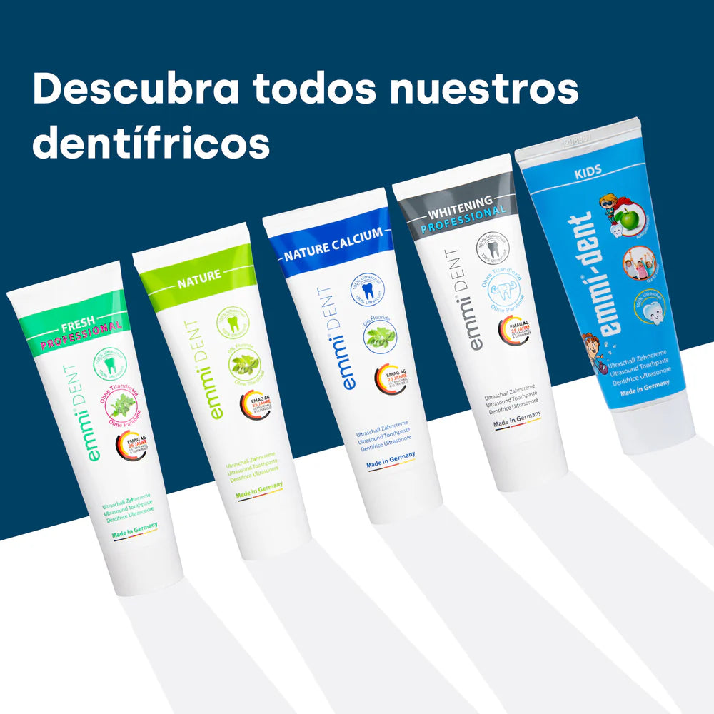 Gracias a la avanzada tecnología de ultrasonidos de la pasta de dientes emmi-dent Nature, la placa se elimina de forma suave y completa. Incluso los depósitos más persistentes se eliminan eficazmente, dejando la boca limpia y saludable. La combinación de gel de sílice y las ondas ultrasónicas de nuestro cepillo de dientes ultrasónico eléctrico garantiza una limpieza profunda, mientras que el sorbitol es suave con los dientes y las encías. Nuestra pasta de dientes deja tus dientes impecablemente limpios y tu sonrisa brillando por completo.